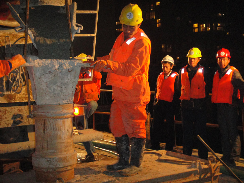 2011年11月12日2点30分瓯江大桥南引桥第一根水中钻孔桩灌注成功